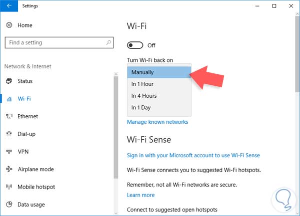 En esta ventana seleccionaremos la línea Wi-Fi y debemos deshabilitar la red pulsando en el botón On para que pase al estado Off y podemos ver en la parte inferior el campo Turn Wi-Fi back on con las diferentes opciones: