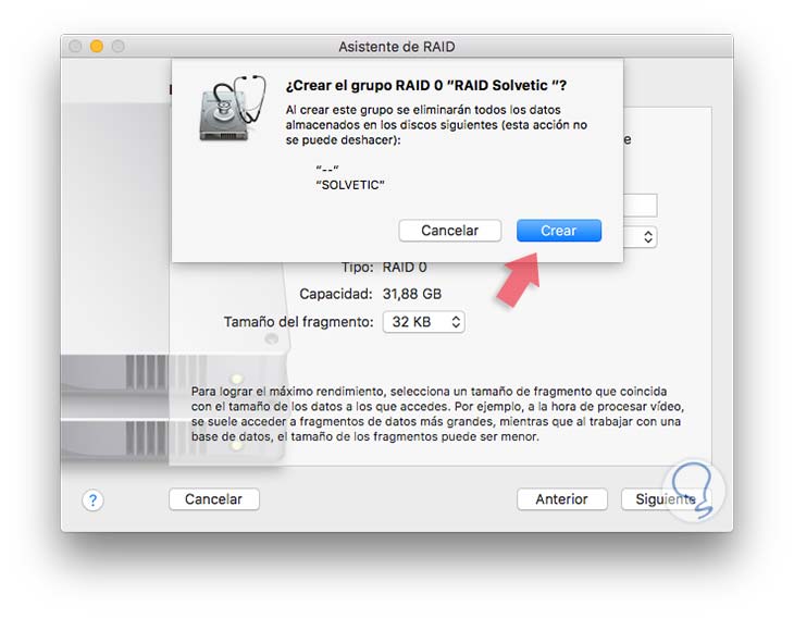 Pulsamos de nuevo Siguiente y se desplegará el siguiente mensaje indicándonos que al crear el RAID en el disco seleccionado se borrará toda la información almacenada, si estamos seguros pulsamos Crear