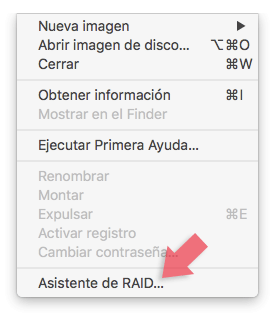 Estando en la ventana de utilidad de discos iremos a la ruta Archivo / Asistente de RAID