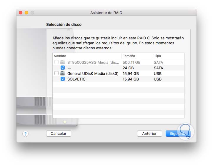 Seleccionamos el tipo de RAID, en este caso el cero (0), y pulsamos Siguiente.En la ventana desplegada debemos seleccionar el disco o los discos que vamos a adicionar a este tipo de arreglo, allí podremos conectar discos externos.