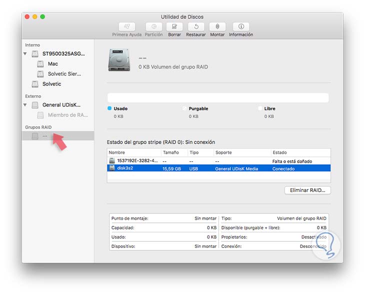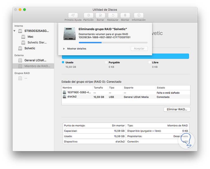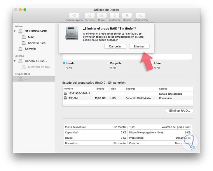 El proceso para borrar el RAID de Mac OS Sierra es muy sencillo. Basta con acceder a la utilidad de discos, seleccionar el disco que hemos creado como RAID y seleccionar la opción Eliminar RAID ubicada en el costado derecho. Al pulsar clic en dicho botón veremos lo siguiente: