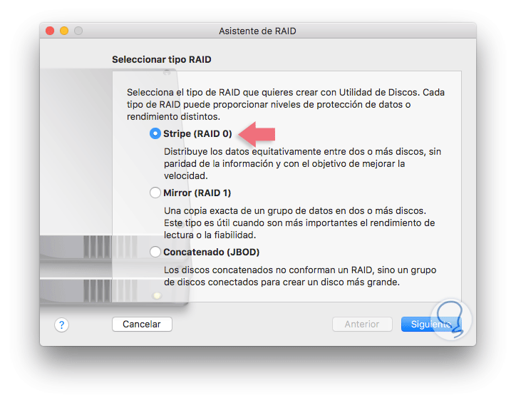 Allí debemos definir el tipo de RAID que implementaremos en macOS Sierra (Tipo 1 o Tipo 2) y adicional vemos que podemos usar la opción JBOD la cual en sí no cumple las funciones de un RAID sino que nos permite ampliar el almacenamiento de nuestros discos.