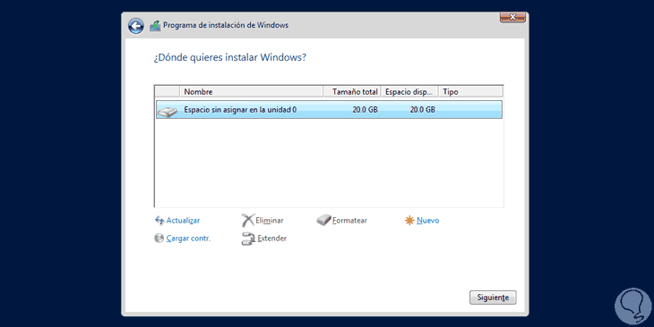 Al pulsar Siguiente debemos definir en que disco se ha de instalar Windows Server 2016 Core.
