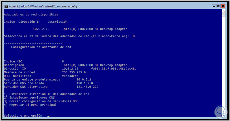 Adicionalmente podemos ver la configuración, por ejemplo, de los parámetros de red usando la opción número 8.