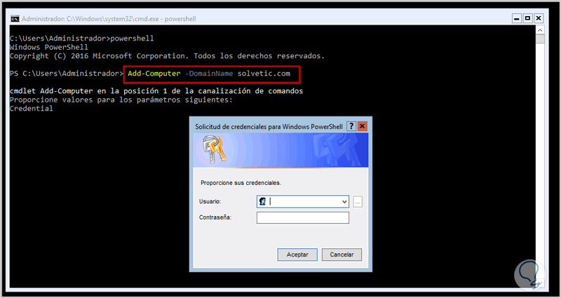 Por ejemplo, para añadir este servidor a un dominio existente usamos el cmdlet siguiente. Allí ingresamos los respectivos credenciales y continuamos el proceso.