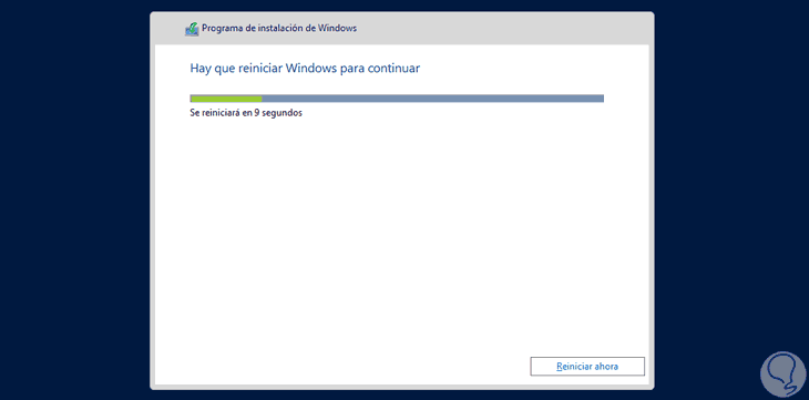 Hasta este punto es el proceso normal en cualquier instalación de Windows. Este proceso toma alrededor de 10 minutos y veremos que debemos reiniciar el equipo.