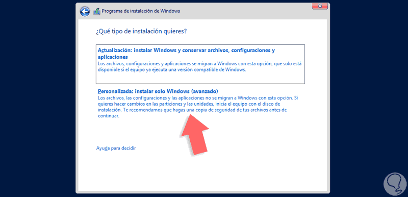 Una vez definida nuestra edición en modo core pulsamos Siguiente y aceptamos los términos de licencia. Pulsamos de nuevo Siguiente y en la siguiente ventana definimos el tipo de instalación que realizaremos, actualización o personalizada, en este caso seleccionamos la opción Personalizada.