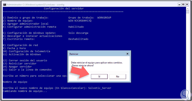 Allí podemos seleccionar el número sobre el cual deseamos establecer la configuración en Windows Server 2016, por ejemplo, para modificar el nombre del equipo ingresamos el número 2 y veremos lo siguiente. Podemos ver que el sistema nos solicita reinicio para aplicar los cambios.