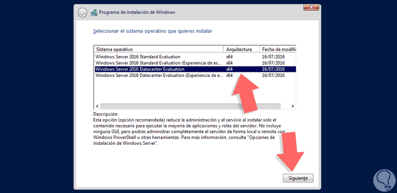 A continuación, debemos elegir la edición de Windows Server 2016 a instalar.