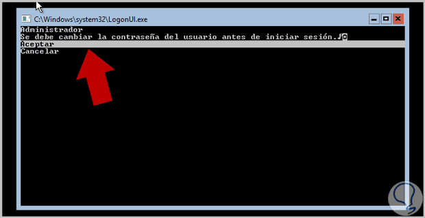 Cuando instalamos Windows Server 2016 en este modo, Core, por defecto en la primera ventana que se despliega debemos establecer la contraseña administrativa, para ello pulsamos Aceptar en la ventana desplegada e ingresamos la respectiva contraseña. Pulsamos Enter para que los cambios sean aplicados.