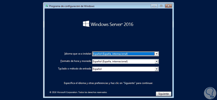 Una vez configuremos el equipo donde hemos de instalar Windows Server para que el booteo o arranque sea desde la unidad de CD/DVD y tengamos el CD/DVD con la imagen veremos el siguiente entorno y una vez carguen los archivos procedemos a definir el idioma de instalación de Windows Server 2016.