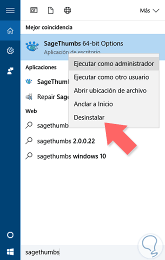 Para desinstalar el programa ve al buscador de Windows y teclea SageThumbs en él hasta que aparezca.