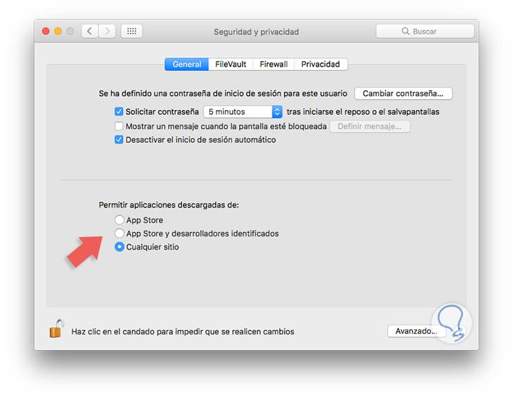 Allí vamos a la pestaña General y bajo el campo Permitir aplicaciones descargadas de definimos el nivel de seguridad que consideremos necesario. Veremos que ahora tenemos la opción de "Cualquier sitio" habilitada, para que podamos seleccionar en aquellos casos en los que nos resulte necesario para realizar una descarga.