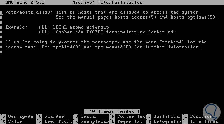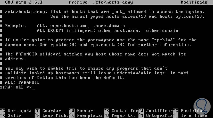 sudo nano /etc/hosts.denyAllí debemos añadir la siguiente línea al final del archivo: