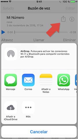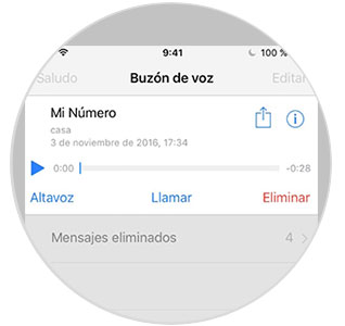 Una vez que finalice esta llamada, podemos acceder a nuestro buzón de voz y escuchar este mensaje. Para poder compartirlo tenemos que activar el buzón visual de iPhone. Veremos cómo ha quedado registrada en formato de grabación de voz.