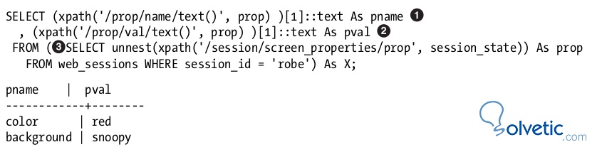 Para hacer consultas sobre el XML podemos utilizar la función xpath() ya que es bastante útil para este propósito, el primer argumento que recibe es un query del tipo XPath y el segundo es un string que contiene el XML, la respuesta es un array de objetos XML que cumplen con las condiciones de la consulta XPath. Veamos un ejemplo de como realizar esto combinándolo con la función unnest() de forma de mostrar los resultados como si fuesen filas de una tabla.