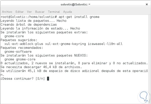 La otra alternativa con la cual podemos instalar GNOME es usando directamente la terminal e ingresando el siguiente comando. Allí aceptamos la descarga y esperamos que todos los paquetes sean descargados e instalados.