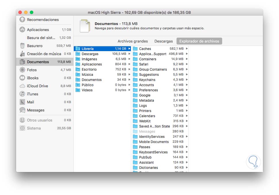 Allí podemos navegar por las diferentes categorías e ir eliminando aquellos archivos que consideremos innecesarios. Podremos hacer uso del explorador de archivos para tener una mejor administración y verificar el tamaño de cada directorio en macOS High Sierra: