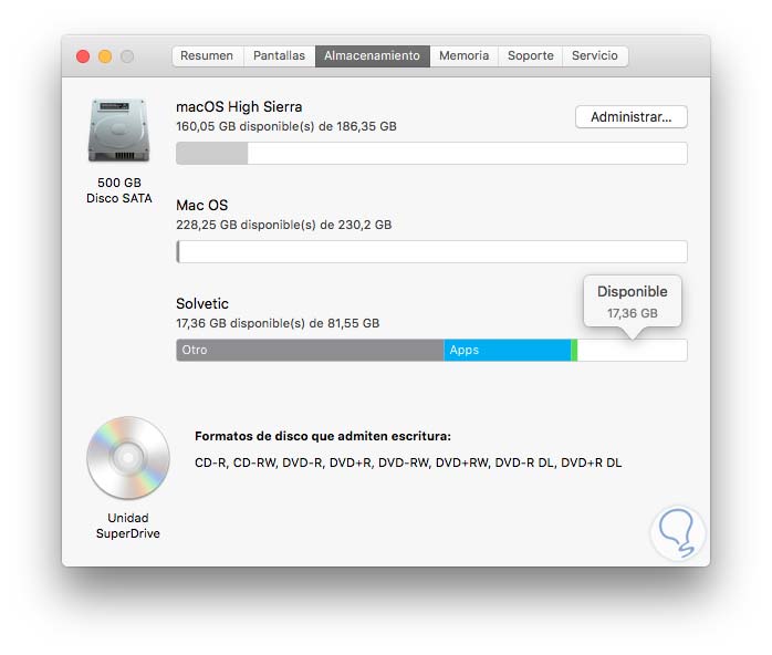 Para un óptimo funcionamiento de macOS High Sierra será necesario contar con un mínimo de 10% total de espacio libre.