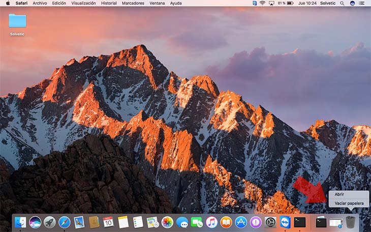 Dar clic derecho sobre el icono de la papelera ubicado en el Dock y seleccionar la opción Vaciar papelera