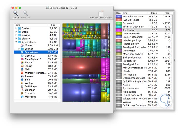 Analizar el espacio en el disco duro macOS es una tarea bastante demandada. Una de las formas más comunes y efectivas con las cuales podemos liberar espacio en macOS Sierra es realizar un análisis completo al disco duro para determinar cómo está distribuido el espacio en el mismo y así determinar con precisión que es viable eliminar. Para este fin podemos descargar la utilidad Disk Inventory X.