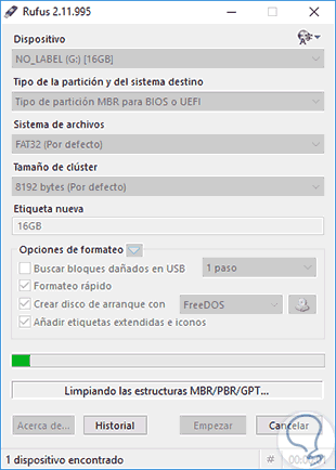 El primer paso consiste en conectar nuestra memoria USB al equipo para que Rufus la detecte de forma automática. Allí debemos asegurarnos que la casilla Crear disco de arranque con esté seleccionada y la versión que debemos elegir será FreeDOS. Con esto definido pulsamos el botón Empezar para dar inicio al proceso de creación.