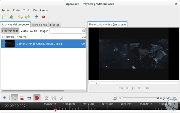 Una vez hayamos descargado e instalado OpenShot en cualquier distro de Linux veremos el siguiente entorno de trabajo: