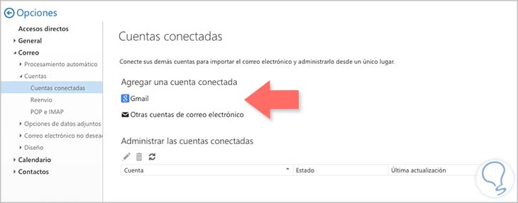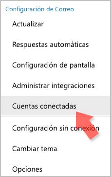 Ahora lo siguiente que tenemos que hacer es acceder a nuestra cuenta de Outlook y dirigirnos a la rueda de engranaje para que en su menú desplegable seleccionemos “Cuentas conectadas”.