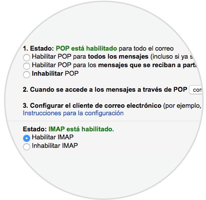 Dentro de la configuración, tenemos que seleccionar la pestaña de “Reenvío y correo POP/IMAP”. Una vez aquí, tenemos que habilitar las opciones del correo POP y el acceso IMAP.