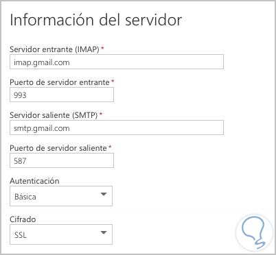En el caso de que nos de error, tenemos que rellenar la informacion del servidor en funcion del tipo de cuenta que hayamos seleccionado. En este caso son los datos correspondientes a Gmail.