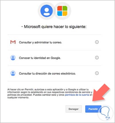 Lo siguiente que debemos hacer es darle autorización a Microsoft para que pueda consultar y administrar nuestro correo en este caso de Gmail, conocer nuestra identidad de Google y consultar nuestra dirección de correo electrónico. Si estamos de acuerdo con ello, seleccionamos “Permitir”.