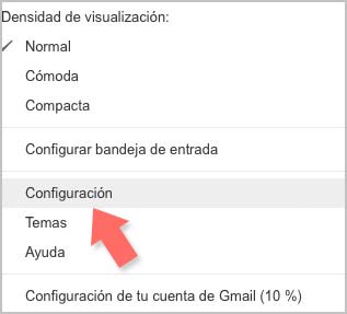 Lo primero que tenemos que hacer es habilitar en nuestra cuenta de Gmail el acceso POP o IMAP. Para ello seleccionamos la rueda de engranaje situada en el lateral derecho, y en su menús desplegable hacemos clic en “Configuración”