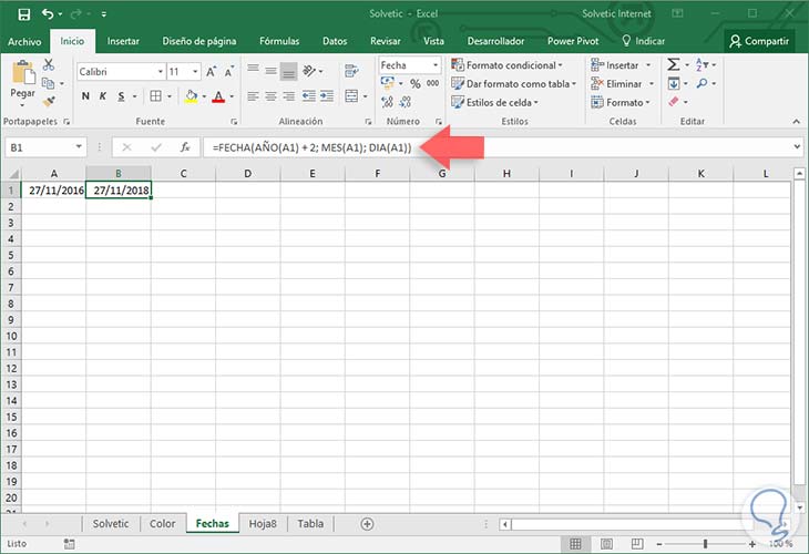 Para esto usaremos la función FECHA de la siguiente manera: Si deseamos añadir dos años a la fecha indicada usaremos la siguiente línea:
