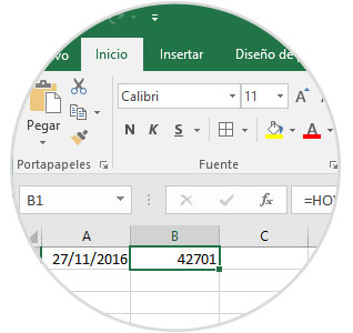 Por ejemplo podemos agregar la fecha 27/11/2016 en la celda A1 y en la celda B1, posteriormente seleccionamos la celda B1 vamos a la pestaña Inicio grupo Numero y elegimos el formato General para ver el resultado.