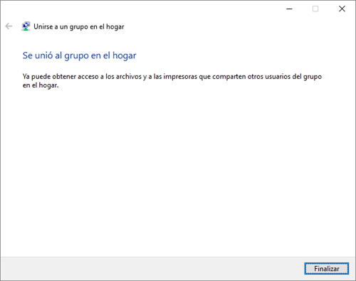 Pulsamos en Finalizar para salir del asistente y concluir el proceso de creación del Grupo Hogar en Windows 10. Podemos ver que se ha creado el Grupo Hogar de manera correcta y tenemos diversas opciones para la administración del mismo.