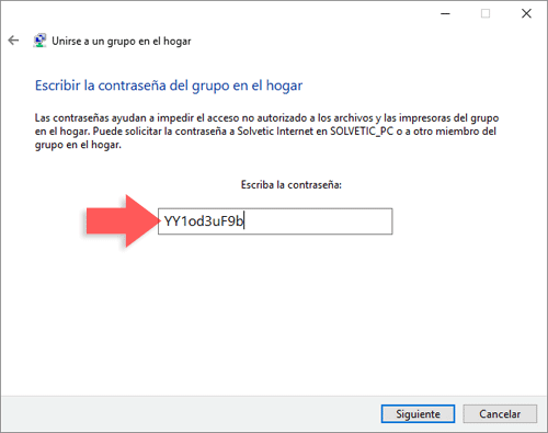 Pulsamos Siguiente y a continuación debemos ingresar la contraseña que ha de ser suministrada por el administrador donde está creado el Grupo Hogar.
