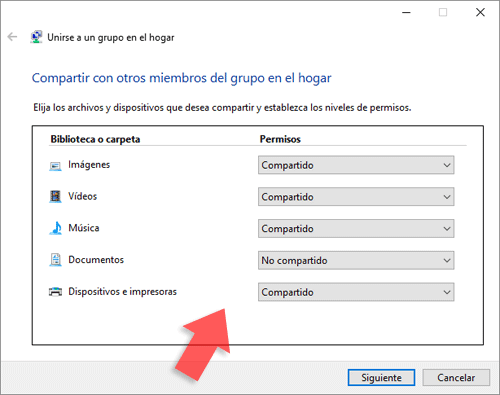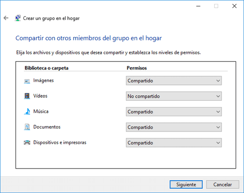 Pulsamos Siguiente y en la siguiente ventana debemos definir qué elementos compartiremos dentro del nuevo Grupo Hogar.