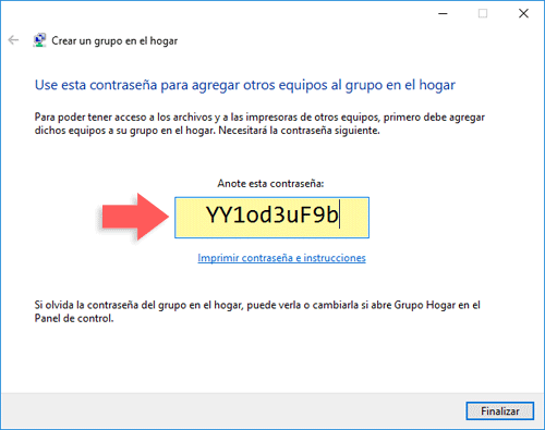 Una vez definidos estos permisos pulsamos Siguiente y veremos que el asistente nos proporciona la contraseña de acceso la cual debemos compartir con los equipos que deseen pertenecer al Grupo Hogar.