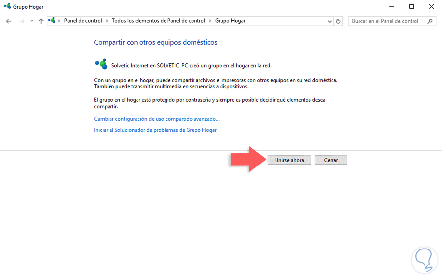 2. Vincular y añadir equipo al Grupo Hogar en Windows 10