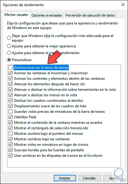 Damos clic en el botón “Configuración” en la sección “Rendimiento”. Luego activamos la casilla “Personalizar” en la pestaña “Efectos visuales” y desactivamos la casilla “Animaciones en la barra de tareas”. Damos clic en Aplicar y Aceptar para guardar los cambios y de este modo desactivar las animaciones de la barra.