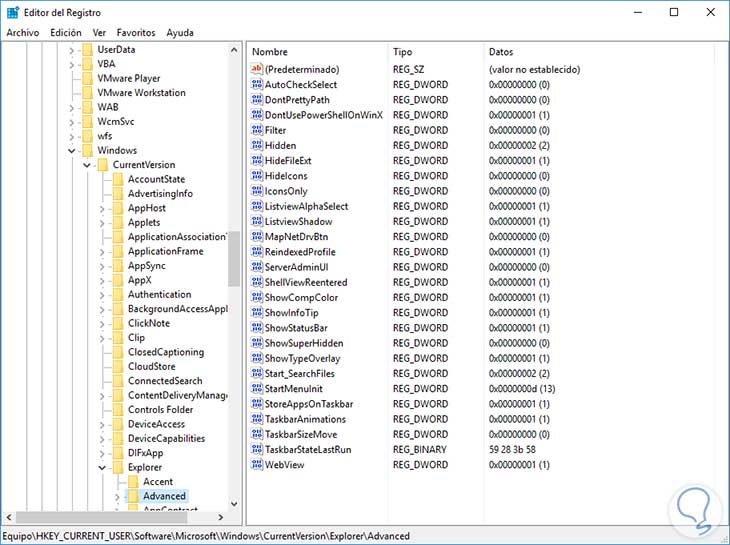 2. Quitar vista previa barra de tareas Windows 10 desde Editor de Registro