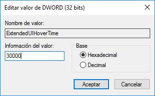 Ahora damos doble clic sobre este nuevo valor o damos cli derecho / Modificar y en la ventana desplegada modificamos el campo Valor de cero (0) a 30000. Pulsamos Aceptar para guardar los cambios. Podemos cerrar el editor de registros. Debemos reiniciar el equipo para que los cambios surtan efecto.