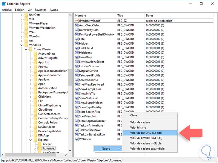 HKEY_CURRENT_USER\Software\Microsoft\Windows\CurrentVersion\Explorer\Advanced