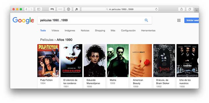 peliculas 1990..1999Veamos el resultado que nos arroja Google al utilizarlo, con lo cual obtendremos información de películas en el rango de 1990 y 1999.