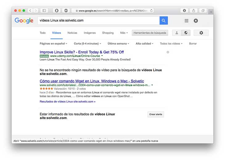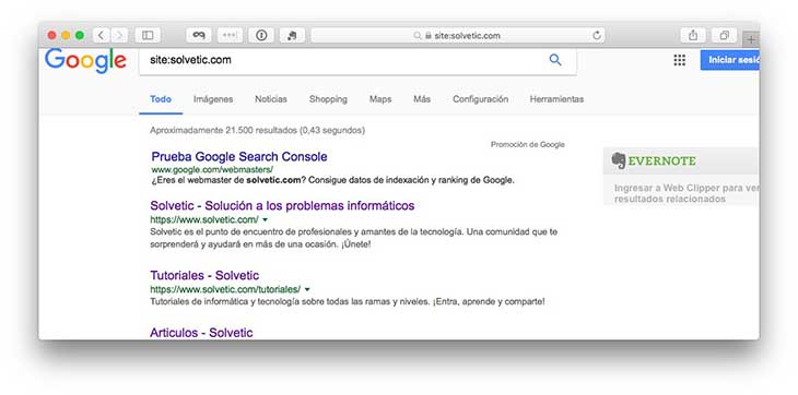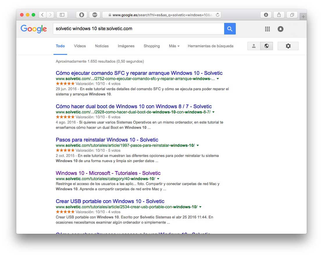 site:solvetic.comEsto lo que hará es buscar todo lo relacionado con el portal Solvetic.com, veamos los resultados que nos arroja esta búsqueda.