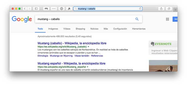 Con esto le decimos al motor que busque por la palabra Mustang pero que elimine del resultado todo lo que tenga la palabra caballo, algo sumamente útil para buscar información y excluir lo que no nos interesa.