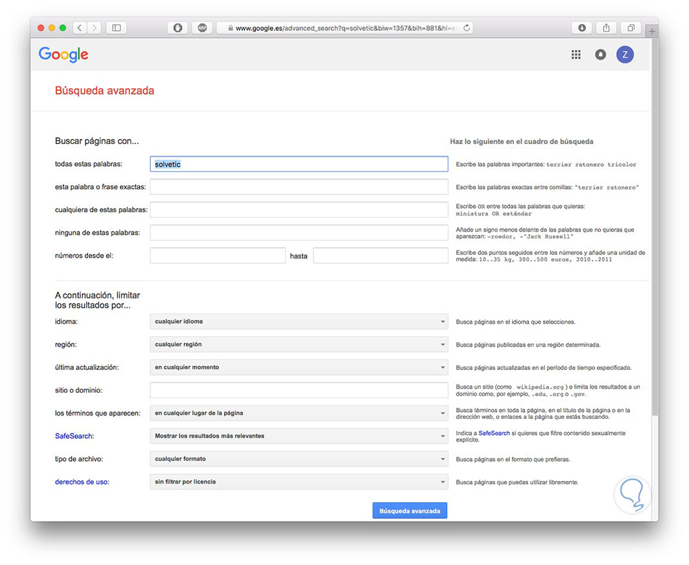 Allí tenemos una serie de valores que nos permitirán realizar una búsqueda mucho más completa. Podemos usar el campo esta palabra o frase exacta para limitar la búsqueda exclusivamente a dicho término, por ejemplo buscaremos los siguientes parámetros.
