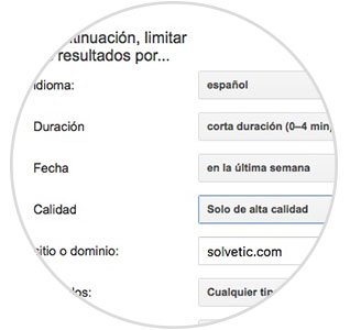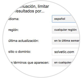 - En el campo Sitio o dominio especificaremos que busque exclusivamente en Solvetic.com