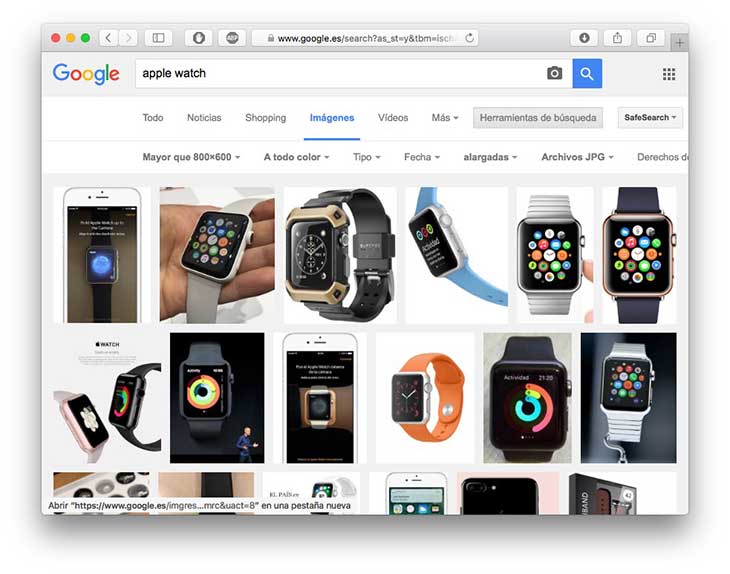También contamos con la opción de realizar una búsqueda avanzada de imágenes con el fin de obtener las imágenes más llamativas y de calidad. Para ello en la búsqueda de Google seleccionamos la pestaña Imágenes y vamos a Preferencias / Búsqueda avanzada En este ejemplo buscaremos todas las imágenes asociadas a Apple Watch pero con los siguientes valores.