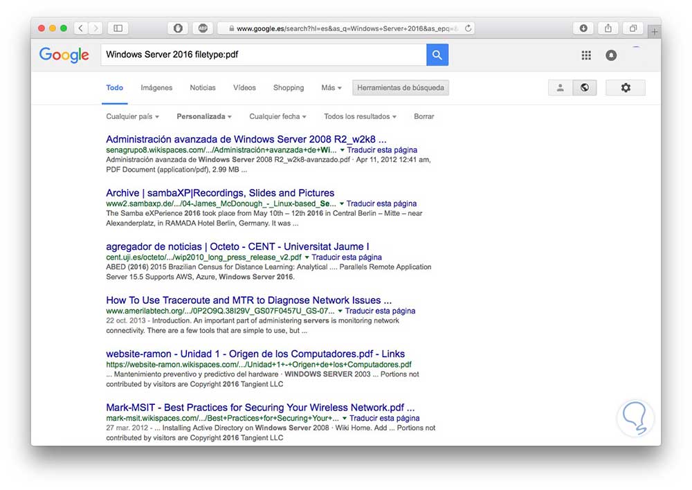 Otro ejemplo de lo que la búsqueda avanzada de Google es capaz de hacer, supongamos que deseamos buscar los archivos en PDF de Windows Server 2016 que podemos usar libremente para estudio, para ello introduciremos los siguientes valores.
